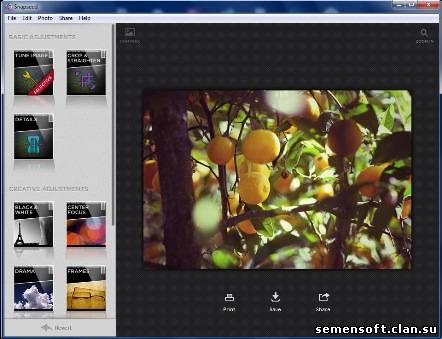C помощью Snapseed можно обрабатывать цифровые изображения. Среди доступных операций: автоматическая коррекция изображения, добавление рамок, применение эффектов, отправка готовых проектов по электронной почте, а также на Facebook и Flickr. Также фотографии можно распечатывать с использованием беспроводной технологии AirPrint.