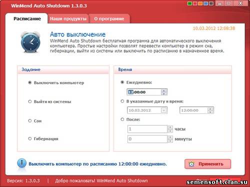 Чрезвычайно простая утилита, которая автоматически отключит компьютер в нужное время. Также может отправить компьютер в спящий (hibernate) или ждущий (stand by) режим, либо выйти в меню выбора пользователей.